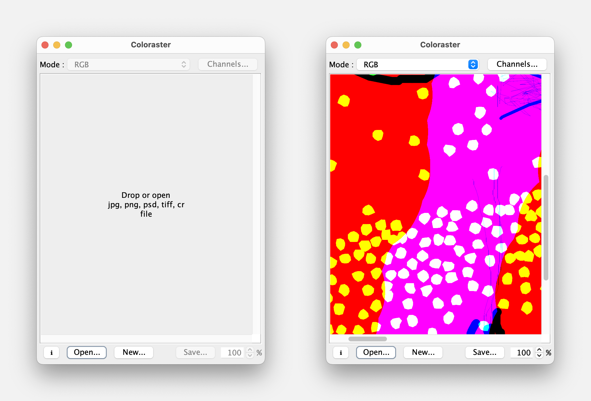 1.3 Pour importer une image, changer d’image ou ouvrir un projet Coloraster, glisser-déposer un fichier dans la fenêtre