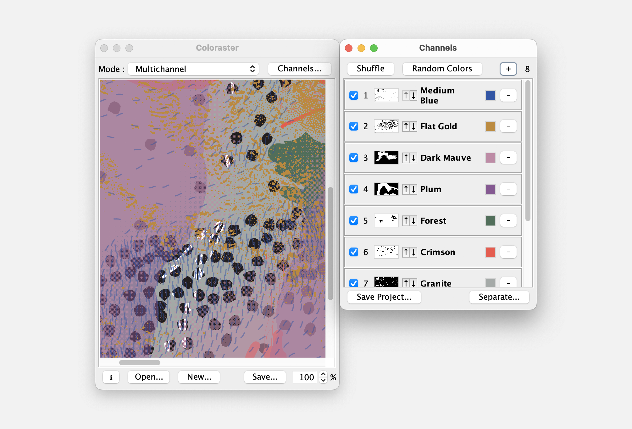 - Multichannel transforme les couches du mode précédent en calques superposés et mélangés. Simule une image multicouche en synthèse soustractive.