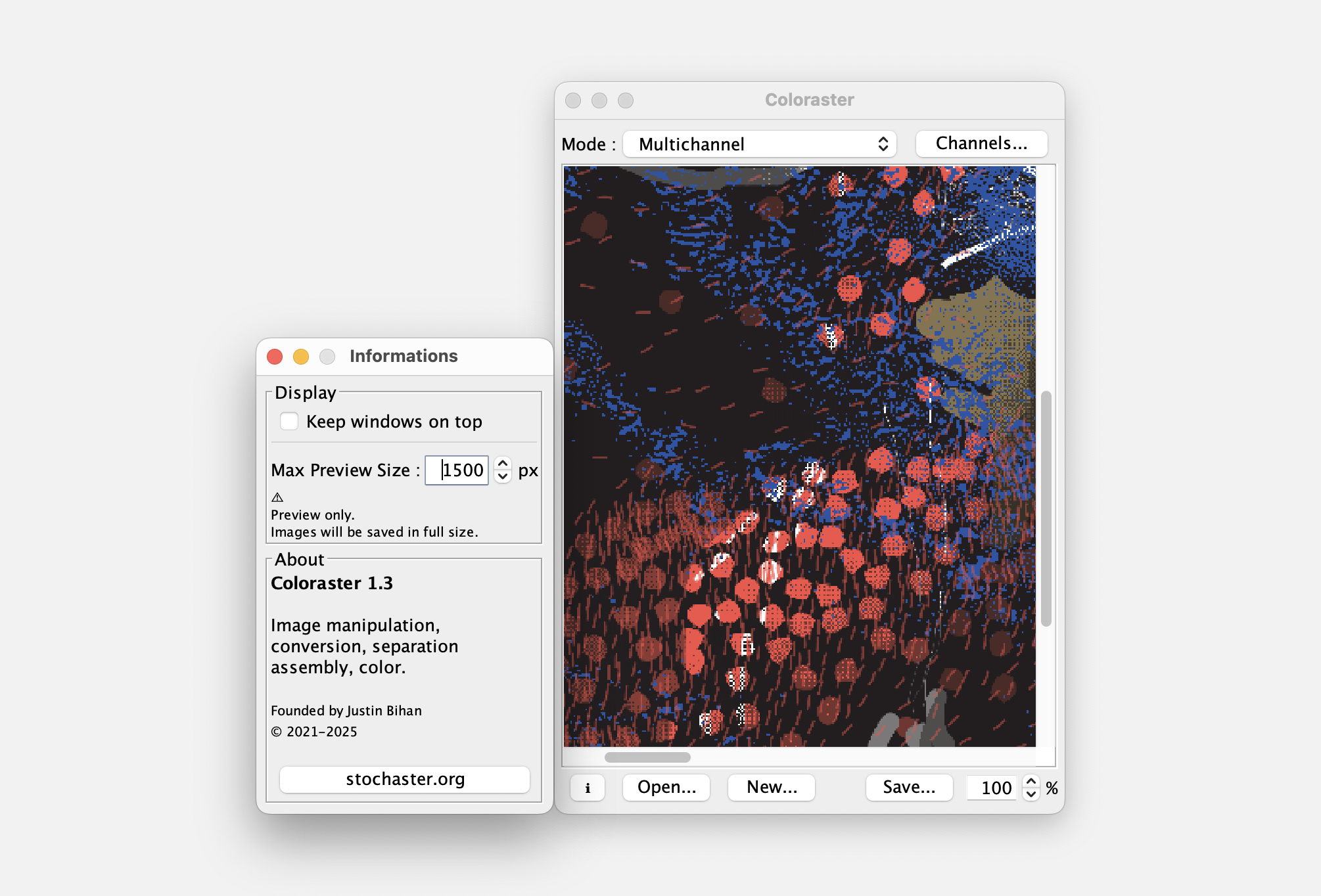 1.2 Zoom lets you zoom in/out on the image. Depending on the size, the displayed image may appear pixelated compared to the original image. This only affects the display. In all cases, the image and channels will be saved at their original size.